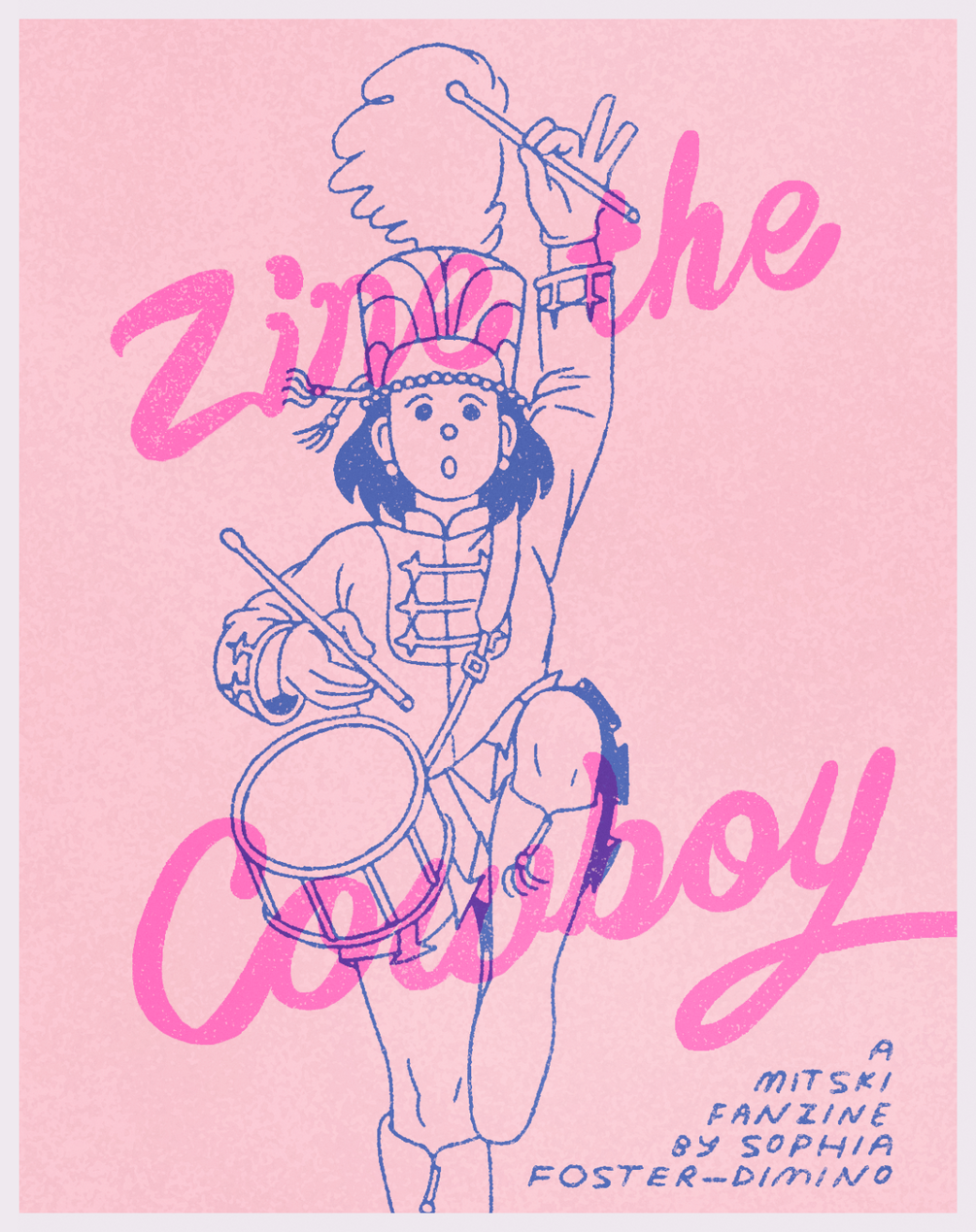 A Mitski fanzine! 32 pages, blue and pink riso ink on pink and blue paper. Words, illustrations, and comics framed as track-by-track commentary on Mitski's 5th album, Be the Cowboy.